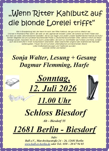 "Wenn Ritter Kahlbutz auf die blonde Lorelei trifft", Lesung mit Geschichten und Sagen aus Deutschland mit traditionellen deutschen Liedern für Sopran und Harfe, Sonntag, 12. Juli 2026, 11:00 Uhr, Schloß Biesdorf, 12681 Berlin- Biesdorf, Alt-Biesdorf 55